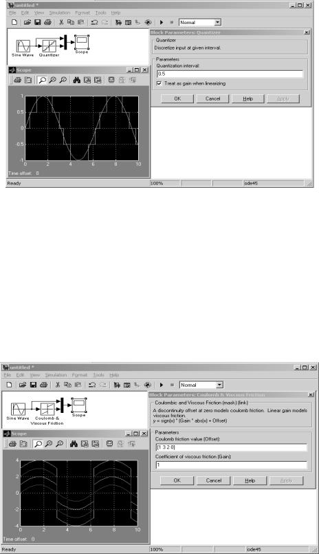 Блок фрикционных эффектов Coulombic and Viscous Friction служит для моделирования фрикционных эффектов (рис. 8.10). Передаточная функция блока указана в окне установки его параметров.