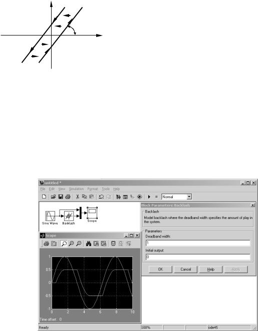 Блок Backlash имитирует эффект возникновения люфта (рис.8.12) и известен в ТАУ как звено с мертвым ходом. Этот эффект создает передаточную характеристику гистерезисного типа, которая представляется графически в пиктограмме блока.