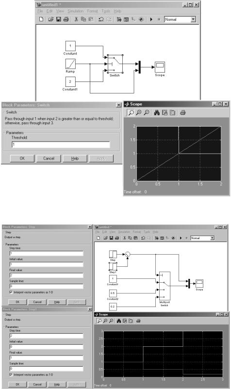 2) Switch (переключатель) – у этого блока переключение осуществляется также между двумя входами (первым и третим), причем сигнал проходит через первый вход, если значение на управляющем входе (второй вход) больше или равно значению, заданному в параметрах (Parameters) данного блока. В противном случае сигнал проходит через третий вход
