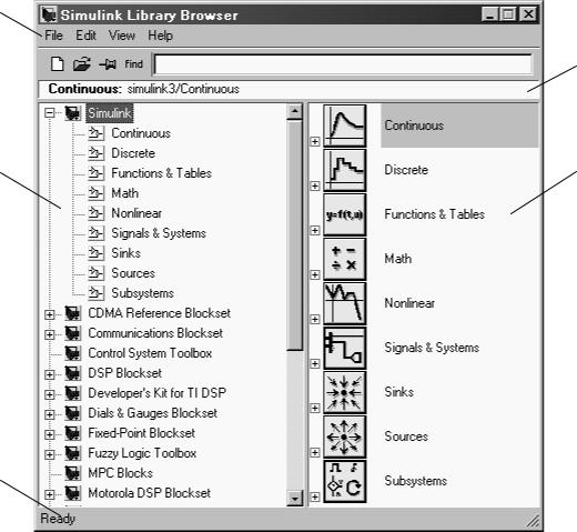В окне браузера содержится дерево компонентов библиотек Simulink. Для просмотра того или иного раздела библиотеки достаточно выделить его нажатием левой кнопки мыши, и в правой части окна Simulink Browser Library появится набор пиктограмм компонентов активного раздела библиотеки.