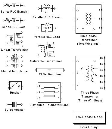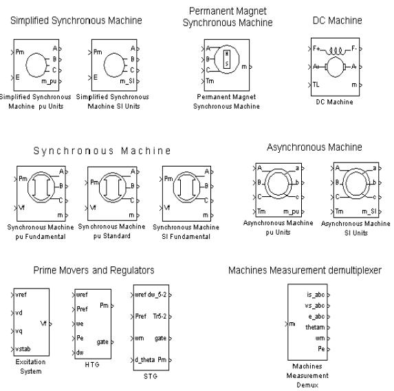 Эта библиотека (рис. 10.8) содержит синхронные, асинхронные машины и машины постоянного тока. Все машины могут быть представлены как в абсолютных, так и относительных единицах. Универсальный блок Measurement demultiplexer позволяет измерить требуемые переменные состояния машины.