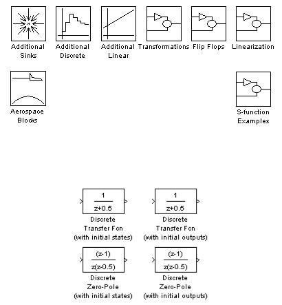 Дополнительные блоки Additional Discrete представлены всего четырьмя блоками – по два варианта известных нам блоков Discrete Transfer Fcn и Discrete Zero-Pole (рис 2.11). Их единственным отличием от описанных ранее блоков является возможность инициализации входов и состояний.