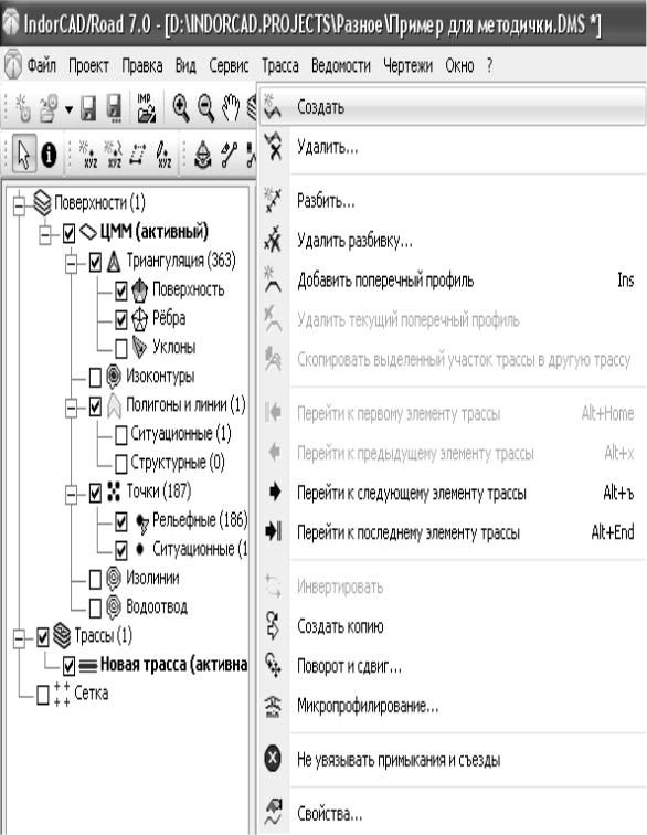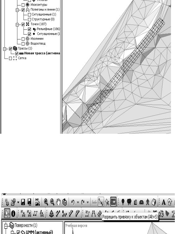 Сначала построим трассу, являющуюся примыканием. Обязательное условие: начало примыкания должно лежать строго на оси основной трассы. Этого можно добиться, если создавать трассу с включенным режимом привязки.
