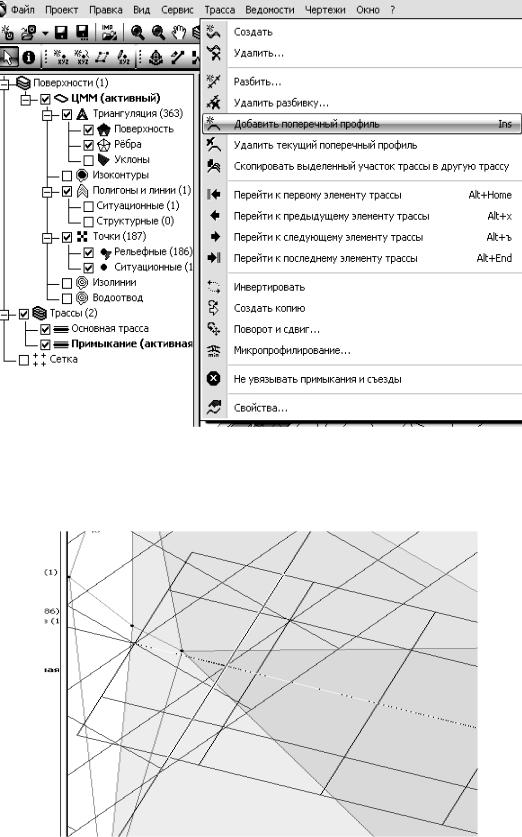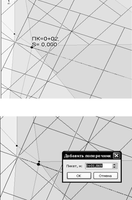 Теперь создайте еще один поперечник: на середине отрезка между созданным поперечником и началом примыкания. Когда указатель мыши привяжется к середине отрезка, щелкните мышью. Появляется пикетное положение дополнительного поперечника.