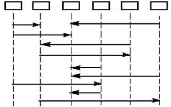 Сценарий – это последовательность событий, заключающихся в воздействиях (посылках сообщений) одного объекта на некоторый другой объект. В ДС объекты изображаются прямоугольниками и располагаются в горизонтальном ряду объектов. Ось времени направлена от этого ряда вертикально вниз. От каждого объекта параллельно оси времени идут так называемые их линии жизни (lifelines). Каждое событие изображается горизонтальной линией со стрелкой от линии жизни объекта, посылающего сообщение, к линии жизни объекта, принимающего сообщение. Над этими линиями возможен поясняющий текст. Линии располагаются одна над другой в порядке, в котором события совершаются (пример ДС на рис. 35).