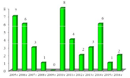Рис. 4. Зависимость количества аварий на объекте по транспортированию углеводородных топлив по годам