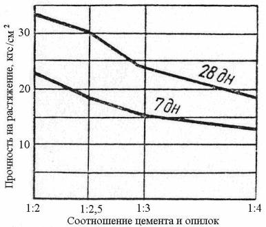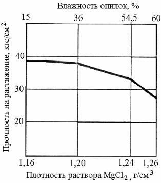 Ф.М. Иванов и Г.В. Гемерлинг [3] проводили испытание образцов, изготовленных из саткинского каустического магнезита и опилок, затворяемых раствором соликамского хлорида магния плотностью 1,197 г/см3. Результаты испытания полученных образцов с соотношениями вяжущего к опилкам 1:2, 1:2,5, 1:3 и 1:4 приведены на рис. 11. Увеличение содержания опилок приводит к снижению прочности при растяжении. Исследовалось также влияние природы опилок. Прочность при растяжении материала на основе сосновых опилок оказалась выше, чем при использовании лигниновых опилок, являющихся отходом гидролизного производства.