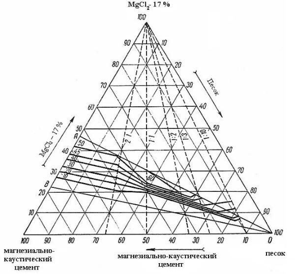 Магнезиальный бетон получают, используя в качестве вяжущего каустический магнезит, в качестве наполнителя – песок, жидкости затворения – раствор хлорида магния. По данным Мюллера составлена трехкомпонентная диаграмма каустический магнезит – раствор хлорида магния – песок (рис. 4). Треугольник АВС с изосклерами растяжения от 10 до 60 кг/см2 ограничивает практически используемые составы. Выше линии АС находятся составы слишком жидкой консистенции, ниже линии ВС – жесткие малопластичные составы.