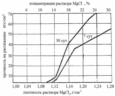 А.П. Ваганов [3] приводит результаты исследования влияния плотности раствора хлорида магния на прочность цементного камня (рис. 5). Для растворов с плотностью более 1,12 г/см3 прочность при растяжении возрастает прямо пропорционально как для образцов в возрасте 7, так и 30 суток. Подобные зависимости получены для цементов, в которых вместо песка использовали кремниевую муку, тальк, опилки, асбест.