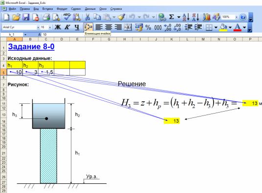 Виртуальная модель гидростатического напора (рис. 7) связана, например, со строительством водонапорных башен, неоходимых для систем наружного водоснабжения небольших городов и посёлков. Следует обратить внимание на курсор в ячейке А5 таблицы Excel, так как этой ячейке исследователь присвоил имя переменной h_1. Это имя можно прочитать в поле таблицы над заголовком столбца А и под наименованием шрифта Arial Cyr, где видно: h_1. Использование имён переменных в электронной таблице весьма напоминает программирование с помощью кода, что делает технологию моделирования виртуальных аналогов процессов и явлений механики жидкости и газа более удобной для исследователя. Синие стрелки на поле таблицы показывают математические связи между ячейками таблицы, что делает её понятной и наглядной. В результате данной виртуальной модели можно убедиться, что напор во всех точках покоящейся жидкости всюду одинаков.