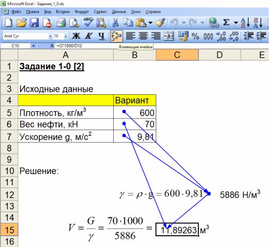 Данная модель получена одним из студентов группы СУЗ-14п1. Подобные модели по физическим свойствам жидкости предлагается получить в ходе данного практического занятия. При этом обучающимся следует обратить внимание на то, что в показанном примере получена виртуальная модель плотности жидкости, работающая интерактивно. Синие стрелки на поле таблицы показывают математические связи между ячейками таблицы, что делает её понятной и наглядной. Также можно заметить в строке формул таблицы использовано имя G для обозначения веса нефти. В конце практического занятия надо записать заключительные выводы и оформить работу письменно в тетради.