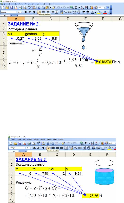 В данном случае с помощью виртуальной модели (см. рис. 2) получено значение динамической вязкости жидкости. Иллюстрация справа от таблицы исходных данных делает более наглядным процесс лабораторного моделирования. Кнопка с всплывающей подсказкой «Влияющие ячейки» в зоне меню MS Excel 2003 добавлена пользователем. Как это сделать – поэспериментируйте и найдите сами. В случае версии электронных таблиц Excel 2007 или более поздней версии такую кнопку организовать сложнее. Однако обучающемуся не следует бояться трудностей. В таких, более сложных случаях – обращайтесь за подсказками в Интернет.