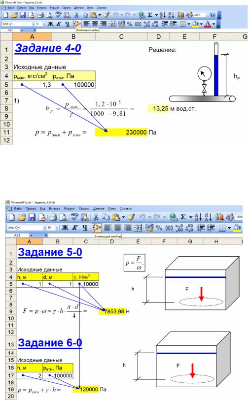 Вкачестве примера приводим модель по заданию из учебного пособия [2] по исследованию основного уравнения гидростатики, построенную в электронной таблице MS Excel 2003, что показано на рис. 4.