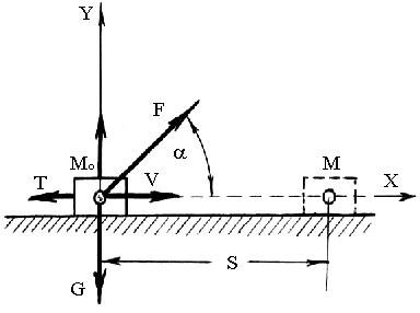 Пусть на тело (рис. 3.7) действует сила F, которая, преодолевая сопротивление трения Т, двигает тело по плоскости со скоростью v из положения M0 в положение M .