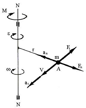 Пусть ось N – N под действием момента М вращается с ускорением . На расстоянии ОА = r от оси прикреплена материальная точка массой m.