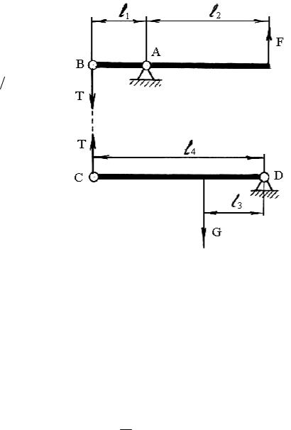 Для получения большого выигрыша в силе применяют систему рычагов (рис. 4.7). Двуплечный рычаг нагружен силой F. Точка В двуплечного рычага соединена канатом с точкой С одноплечного рычага. Через канат на одноплечный рычаг передаётся сила Т, которая поднимает нагрузку G.