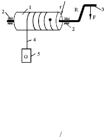 Ворот – это цилиндрический барабан 1, установленный на подшипниках 2 и снабженный рычагом 3 для вращения барабана. Примером может служить колодезный ворот. При вращении рычага 3 канат 4 наматывается на ворот 1 (барабан) и груз 5 поднимается. Плечо рычага R делает больше радиуса ворота r, чтобы получить выигрыш в силе.