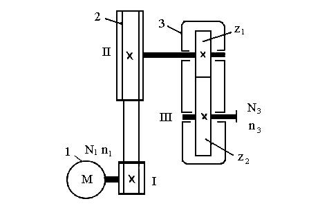 Пример. Выполнить кинематический и силовой расчеты двухступенчатого привода (рис. 5.3), состоящего из электродвигателя 1, ременной передачи 2 и одноступенчатого цилиндрического редуктора 3. Мощность на ведомом валу III N3 = 6,6 кВт, частота вращения n3 = 120 об/мин, КПД ременной передачи рп = 0,95, КПД зубчатой передачи зп = 0,97.