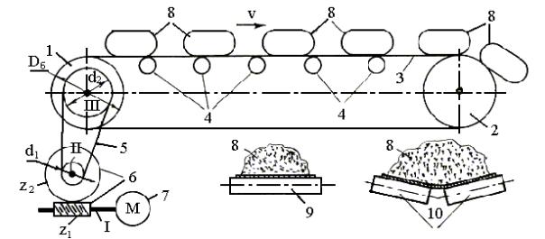 Ведущий барабан 1 получает вращение от приводного двигателя 7 через передачи 5 и 6. Прорезиненная широкая лента 3 охватывает ведущий 1 и ведомый 2 барабаны. Верхняя ветвь ленты поддерживается роликами 4 по всей длине. Ролики 4 могут быть горизонтальными 9 и V - образными 10. Груз 8 кладут на верхнюю ветвь ленты 3, которая непрерывно движется со скоростью v. В конце транспортёра груз 8 либо подхватывается рабочим, либо падает в приёмник, а если это сыпучая масса (песок), то она сыплется в приёмную тару или на пол в кучу.