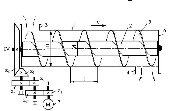 Шнековый транспортёр, или винтовой конвейер, состоит из следующих основных частей: цилиндрического корпуса 1, внутри которого расположен винт или шнек 2 , состоящий из цилиндрического стержня диаметром d и винтовой ленты 5, приваренной к стержню; в корпусе 1 имеется горловина 3 для загрузки перемещаемой массы и горловина 4 для удаления перемещаемой массы; если транспортёр предназначен для выдавливания массы, то горловина 4 отсутствует, а масса выдавливается винтом через отверстия, сделанные в торце 6 корпуса; для сообщения винту 2 вращательного движения имеется передача от электродвигателя 7, состоящая из четырёх валов и шести зубчатых колёс Z1...Z6 .
