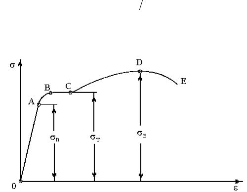 На рис.7.3 изображена диаграмма растяжения образца из малоуглеродистой стали. На участке 0А образец растягивается, как пружина, деформации чисто упругие. Если в точке А убрать нагрузку, то образец вернется в исходное состояние. Деформация на этом участке прямо пропорциональна силе. Точка А соответствует пределу пропорциональности п – наибольшему напряжению, при котором имеет место линейная зависимость между напряжением и деформацией.