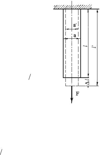 При растяжении стержень удлиняется от l до l'. В поперечном сечении его размер, наоборот, уменьшается от а до а' на величину поперечного сужения а. Относительное поперечное сужение