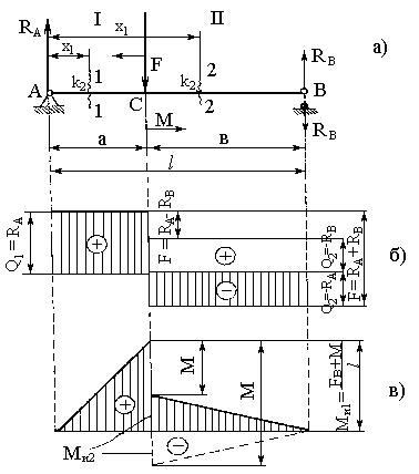 Построим эпюры для балки (рис.11.4,а), лежащей на двух опорах А и В и нагруженной силой F и парой сил с моментом М. Отбросим опоры А и В, заменив их реакциями RА и RВ. Составим уравнения равновесия. Приравняв нулю сумму моментов от внешних сил относительно точки А, получим
