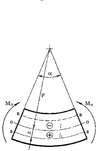Рассмотрим растяжение волокна а-а, длину которого обозначим l1, а длину волокна О-О нейтрального слоя обозначим l. До деформации длина всех волокон равнялась длине волокна нейтрального слоя l. Удлинение волокна а-а равно l = l1-l, а относительное удлинение