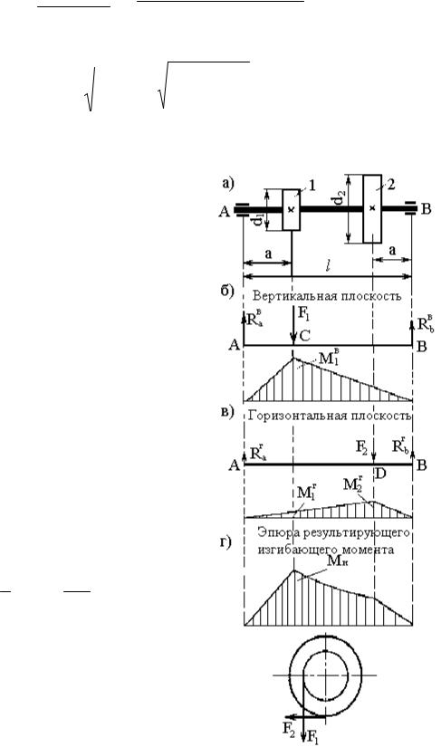 При пространственном нагружении вала поперечными силами в вертикальной и горизонтальной плоскостях в сечениях вала кроме крутящего момента Мк будут действовать два изгибающих момента: под действием вертикальных сил – Мх, а под действием горизонтальных сил – Му. Полный изгибающий момент определится по теореме Пифагора: