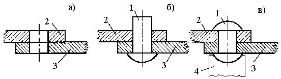 На рис. 14.1 приведено заклепочное соединение, которое состоит из заклепки 1, листа 2 и листа 3. Заклепка является основным элементом соединения, т.к. она скрепляет листы 2 и 3. Заклепка представляет собой круглый стержень, который с одного конца имеет головку (рис. 14.1, б). Для образования заклепочного соединения листы 2 и 3 накладывают друг на друга и прижимают. Затем сверлят в них отверстие (рис. 14.1, а). В отверстие снизу вставляют заклепку (рис. 14.1, б). После этого листы с заклепкой кладут на жесткую опору 4 (рис. 14.1, в), а сверху молотком расклепывают верхний конец заклепки до образования круглой головки.
