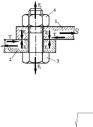 Листы 1 и 2 стянуты болтом 3 и гайкой 4 силой F0, которая растягивает болт, а болт с гайкой в свою очередь стягивают (сжимают) листы 1 и 2. Осевые силы F0 – это реакции листов, которые отжимают от себя головку болта и гайку, растягивая болт. Поверхностные силы F0 – это силы, которыми головка болта и гайка сжимают листы. Силы Q стремятся сдвинуть листы. Между болтом и отверстием в листах имеется зазор, поэтому болт не может, как заклейка, заполняющая отверстие без зазора, удерживать листы своим стержнем. Для того чтобы листы не сдвинулись,