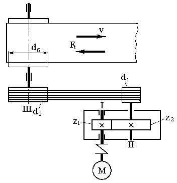 ленты транспортера v = 80 м/мин; диаметр барабана dб = 300 мм; КПД транспортера = 0,87, КПД ременной передачи рп = 0,87, КПД зубчатой передачи зп = 0,87 (с учетом подшипников).