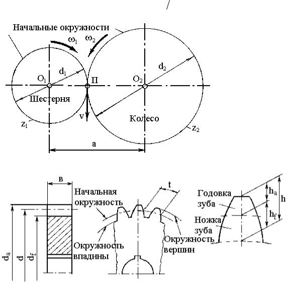 Точка касания П начальных окружностей называется полюсом зацепления. Вращающаяся шестерня увлекает за собой колесо, причем катятся они друг по другу без скольжения. Поскольку точка касания (полюс П) принадлежит и шестерне и колесу, ее окружная скорость v едина для колеса и для шестерни. Из теоретической механики известно, что