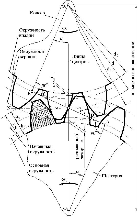При вращении зубчатых колес зуб шестерни перекатывается по зубу колеса. Точка касания зубьев при вращении колес движется по прямой АВ, которая называется общей нормалью. Зуб шестерни встречается с зубом колеса в точке D, далее перекатывается по зубу колеса таким образом, что точка касания (контакта) зубьев движется по прямой АВ, затем в точке С зуб шестерни расцепляется с зубом колеса. Отрезок СD называют длиной зацепления, а отрезок АВ – линией зацепления.