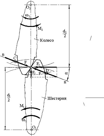 В точке С сила F приложена к вершине зуба шестерни, а в точке D сила F приложена к вершине зуба колеса.