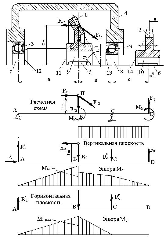 Уступы на валу при переходе с поверхности одного диаметра на поверхность другого диаметра называют заплечиками. Они служат для восприятия осевых сил (заплечики 11 и 12), а также для фиксации положения деталей на валу (заплечики 11 и 14) и вала в подшипниках (заплечики 12 и 13).
