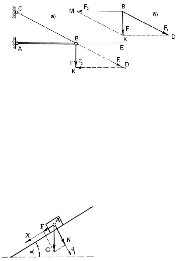 Применяя метод треугольника, из точки В (рис. 1.15, а) проводим продолжение линии CB, а из точки K проводим линию KD║ AB до пересечения с продолжением линии CB в точке D. Отрезок BD соответствует силе F1, отрезок KD соответствует силе F2.