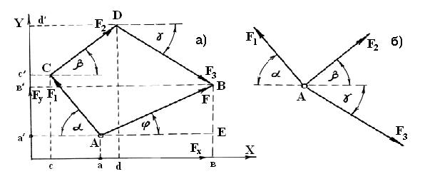 Пусть дана система сходящихся сил F1; F2 и F3 (рис. 1.17, б), которые приложены к точке A. Требуется определить величину и направление равнодействующей аналитическим методом. Произведем вначале графическое сложение сил методом силового многоугольника. Из точки A (рис. 1.17, а) откладываем последовательно векторы F1; F2 и F3 методом их параллельного переноса с рис. 1.17, б. Получим разомкнутый многоугольник ACDB. Равнодействующая F является замыкающим отрезком AB этого многоугольника. Спроектируем все силы на ось X, которые будут изображаться отрезками: