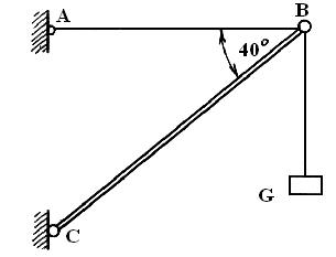 Пример. Груз G = 5 кН подвешен на канате в точке B. Определить усилия в растяжке AB и стержне BC (рис. 1.18).