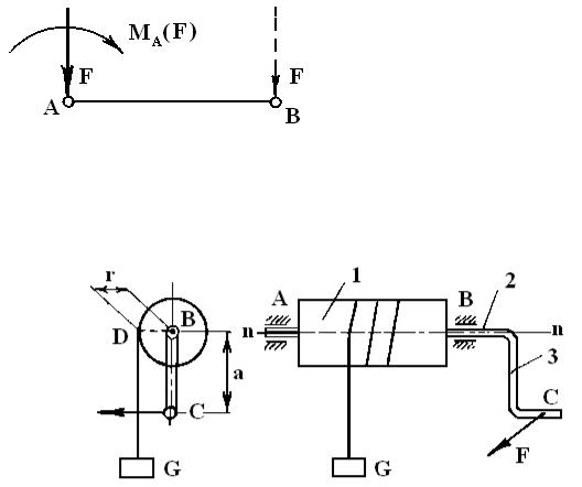 Колодезный ворот (рис. 1.23) состоит из барабана 1, оси 2, установленной в опорах A и B, и рукоятки 3. При подъеме груза G момент, создаваемый грузом G, равен моменту, создаваемому силой F, приложенной к рукоятке.