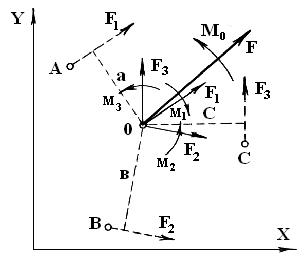 Часто бывает необходимо привести несколько сил к одной точке. Пусть даны силы F1; F2 и F3, приложенные в точках A, B и C. Требуется перенести эти силы в точку О.