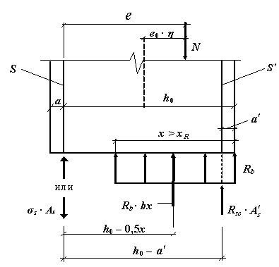 По данной расчетной (см. рис. 43) схеме формируется условие прочности такое же, как и в случае больших эксцентриситетов, отличается только уравнение определения высоты сжатой зоны: