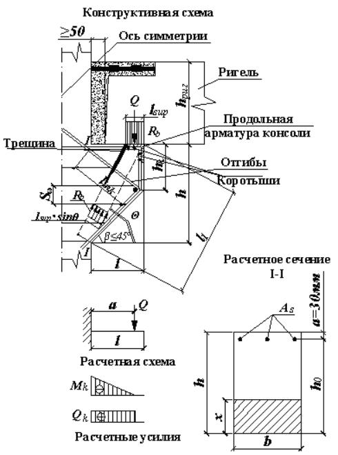 Расчет железобетонных коротких консолей на действие поперечной силы для обеспечения прочности по наклонной сжатой полосе (рис. 45) должен производиться из условия