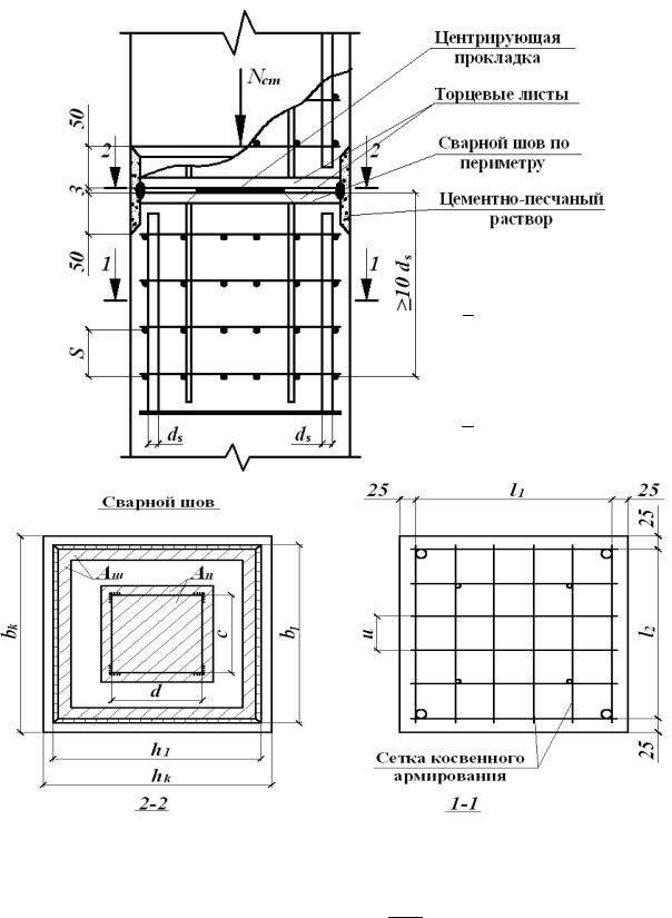Прочность концов колонн в местах обрыва продольной арматуры обеспечивается дополнительными поперечными сетками косвенного армирования. При этом должно удовлетворяться условие [2]: