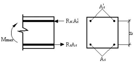 где Мmax – максимальный момент; Аs – площадь поперечного сечения арматуры, расположенной в растянутой зоне сечения, см2; zs – расстояние между центрами тяжести растянутой и сжатой арматуры, см.