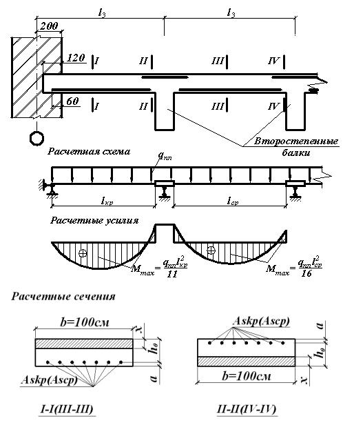При соотношении l1 / l3 ≥ 3 расчетная схема плиты представляет собой многопролетную неразрезную балку, для расчета которой вырезают полосу шириной 1 м вдоль короткой стороны.