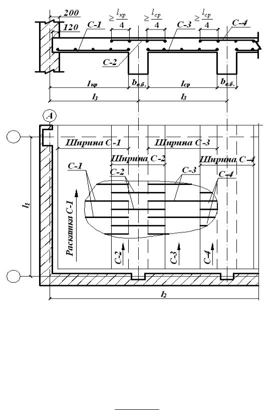 По требуемой площади рабочей арматуры в крайнем пролете и над первой промежуточной опорой принимаются сетки С-1 и С-2 с поперечной рабочей арматурой. По требуемой площади рабочей арматуры для среднего пролета принимаются сетки С-3 и С-4 с поперечной рабочей арматурой. Ширина сеток выбирается в соответствии с требованиями, приведенными на рис. 52. Рулонные сетки раскатываются вдоль второстепенных балок.