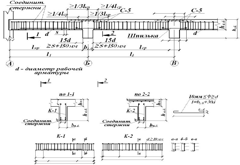 На опорах второстепенные балки армируются двумя сетками с поперечным расположением рабочей арматуры, частично перекрывающими одна другую и раскатываемых вдоль главных балок. Суммарная площадь рабочих стержней этих сеток должна равняться или превышать требуемую площадь рабочей арматуры, определенную расчетом на отрицательный (опорный) момент.