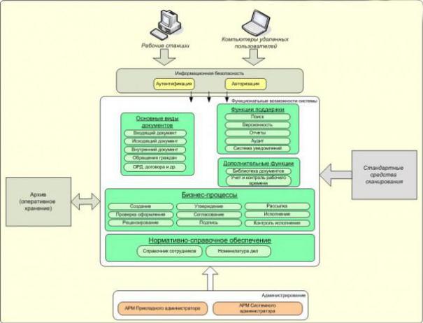 электронного документоо орота, как правило, включает в себя функциональную часть, администраторскую часть и интерфейсную часть. Функциональная часть предназначена для управления и обработки