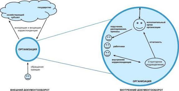 организация взаимодействует с окружающей средой (государством, обществом, гражданами, иными хозяйствующими субъектами), с другой, – с помощью документооборота организация как единая централизованная сущность осуществляет внутреннее взаимодействие меж-